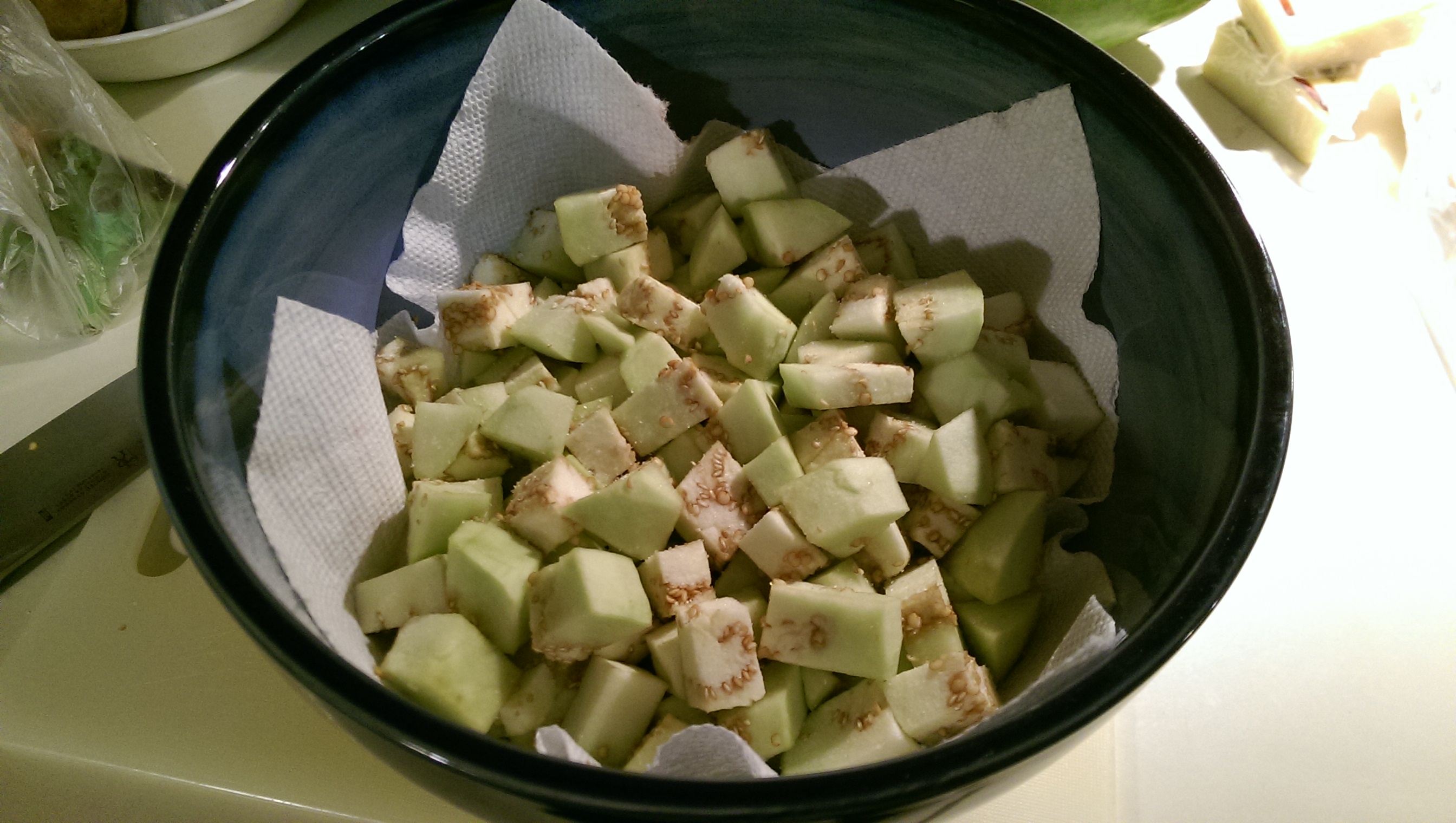 Dice it even smaller than this. I left them a little too big this time (about 1/2 inch dice), but it worked good for the photos 🙂 Put the diced eggplant in a bowl lined with paper towels, tossing with salt as you add to the bowl. It’s time to get the eggplant to sweat.