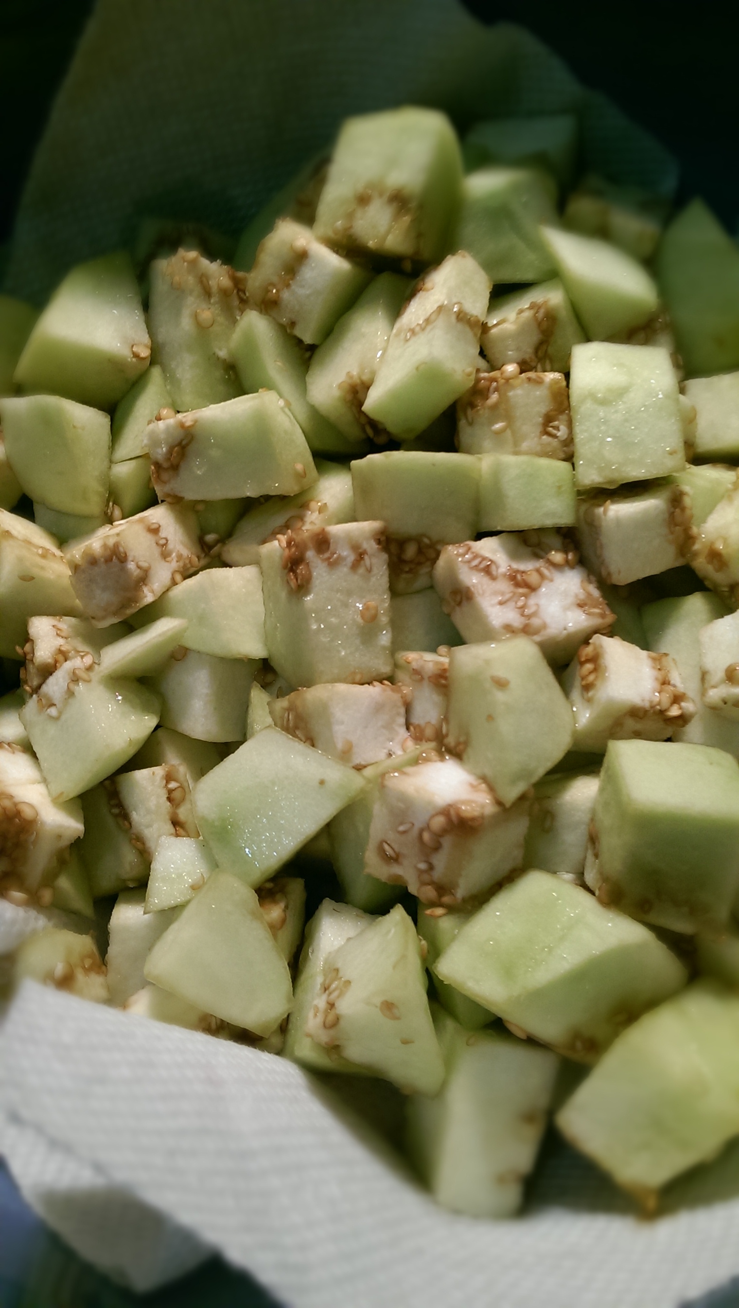 - 1 large or two small eggplants, peeled and diced small (1/4 inch)
