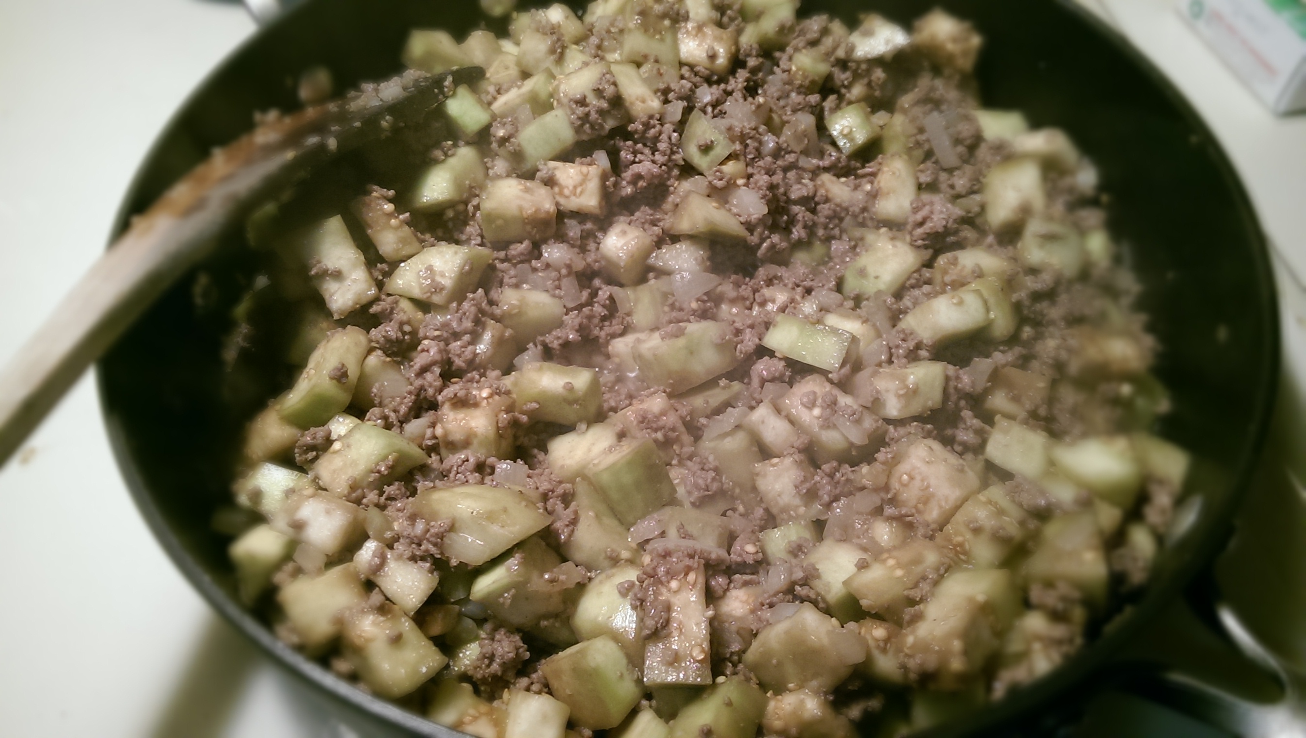 While the meat is still a little pink, add your (hopefully) very sweaty eggplant to the pan.